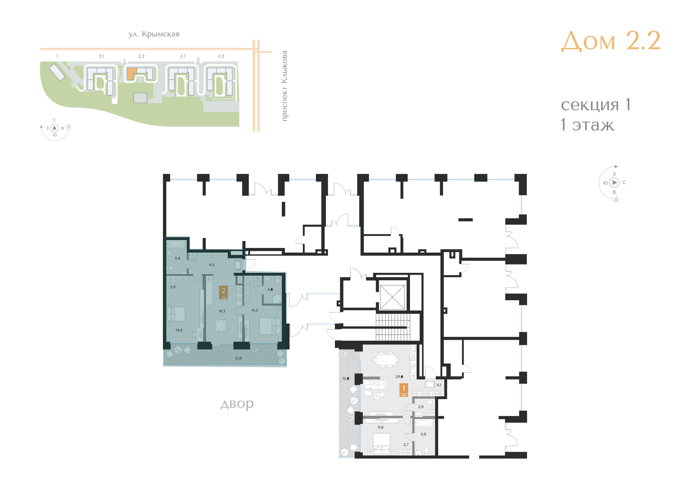 2-комнатная, 73 м2